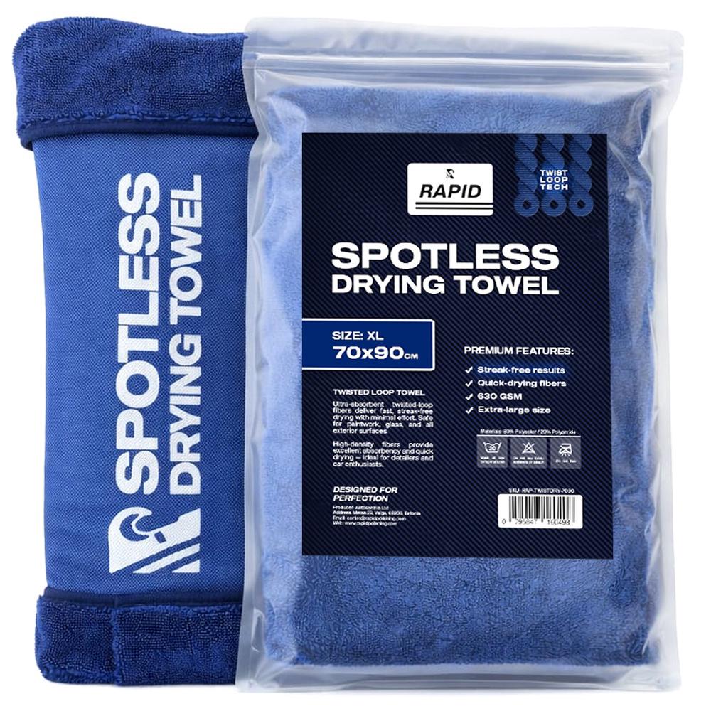 RAPID Spotless Drying Towel (XL) on kõrgekvaliteediline keerdfiibritega kuivatusrätik, mis võimaldab kuivatada auto kiiresti, ohutult ja triibuvabalt. Spetsiaalne kiustruktuur imab suure koguse vett minimaalse survega, vähendades kriimustuste riski tundlikel värvipindadel. Twisted loop mikrofiiber tehnoloogia võimaldab siduda suure hulga vett kiiresti ja efektiivselt. Rätik libiseb sujuvalt üle pinna ning ei jäta ebemeid ega veeplekke.
